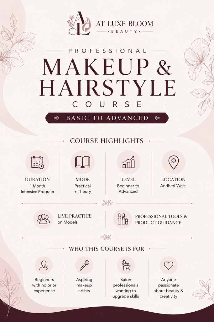 From basic to advanced, including bridal makeup, party looks, hairstyling techniques, product knowledge, and client handling.